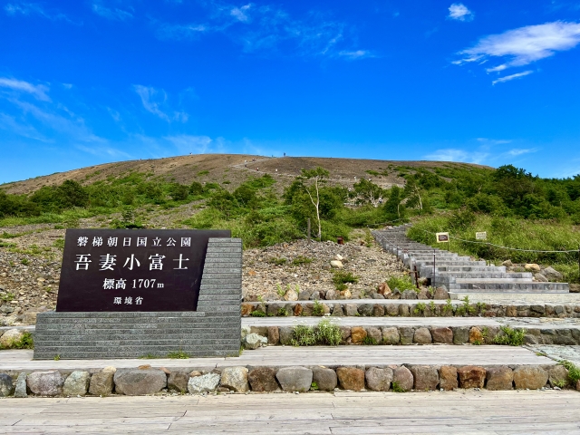 吾妻小富士は、浄土平駐車場から磐梯吾妻スカイラインを横切り、丸太の階段をジグザグと登ること約10分。大きな噴火口を間近に覗くことができます。ザレた滑りやすい道なので足元には気をつけましょう。吾妻小富士の噴火口は、約40分ほどで一周することができます。
