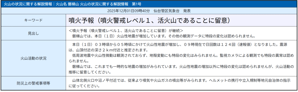 磐梯山 噴火予報(噴火警戒レベル1、活火山であることに留意)