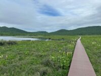 喜多方市にある金沢峠から、雄国沼湿原を目指すコースです。車を降りてすぐの展望台から雄国沼湿原を一望でき、また階段を10分ほど下ると、湿原の中を歩くこともできます。6月末~7月初めには、ニッコウキスゲが咲き誇ります。